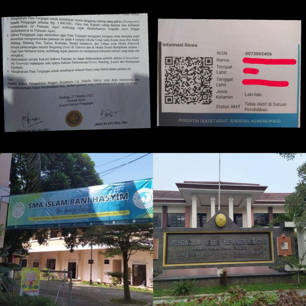 MALANG-METROPAGINEWS.COM ll Gugatan Wali murid yang tidak terima selama anaknya setahun belajar di Sekolah Menengah Atas Islam (SMAI) Bani Hasyim Singosari Kabupaten Malang dengan biaya tinggi, dan Nomor Induk Siswa Nasional(NISN) tidak aktif di satuan pendidikan, juga sekolah tersebut belum terdaftar di Data Pokok Pendidikan (Dapodik) jadi sorotan, Malang (25/6/2024)