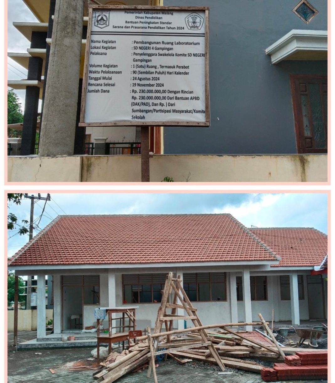 Pekerjaan di SD Negeri 4 Gampingan dimulai pada 24 Agustus 2024 Rencana selesai 19 November 2024. Sementara pembangunan ruang laboratorium di SD Negeri 02 Karangsari – Bantur dimulai 25 Juli 2024 Rencana Selesai 25 Oktober 2024. Masing-masing mengalami keterlambatan.