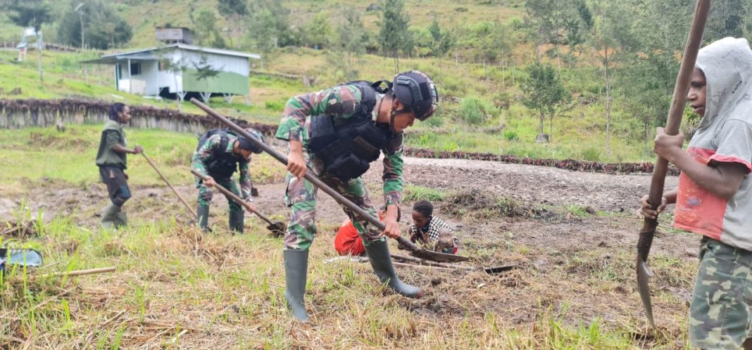 Papua – metropaginews.com || Dalam rangka Tingkatkan Kesejahteraan Ekonomi Warga, Satgas Satuan Organik Yonif Raider 303 Kostrad melalui Pos Wuloni memanfaatkan lahan tidur dengan membuka lahan pertanian di Kampung Wuloni Distrik Ilaga Utara, Kabupaten Puncak Papua.
