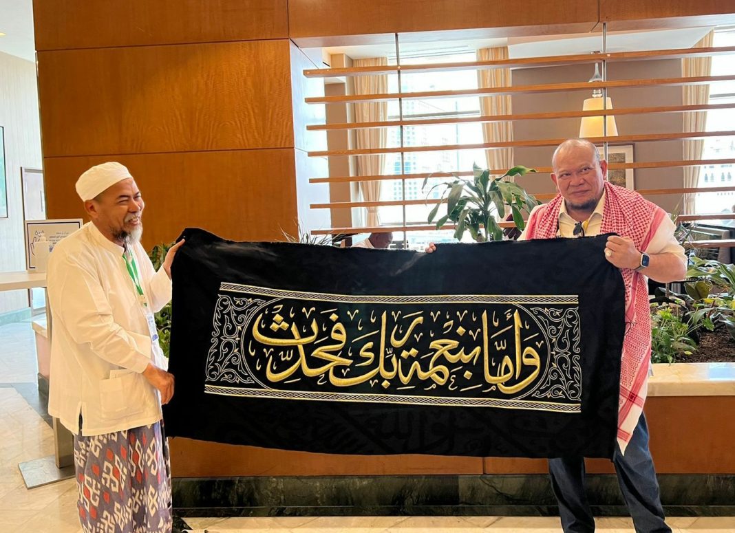 Makkah-metropaginews.com || KH Muhammad Najih Maimoen, yang biasa disapa Gus Najih Maimoen, putra kedua almarhum KH Maimoen Zubair memberikan kaligrafi yang bertuliskan Ayat 11 Surat Ad-Dhuha kepada Ketua DPD RI AA LaNyalla Mahmud Mattalitti saat keduanya bertemu di Makkah, Rabu (13/7/2022) siang waktu setempat.