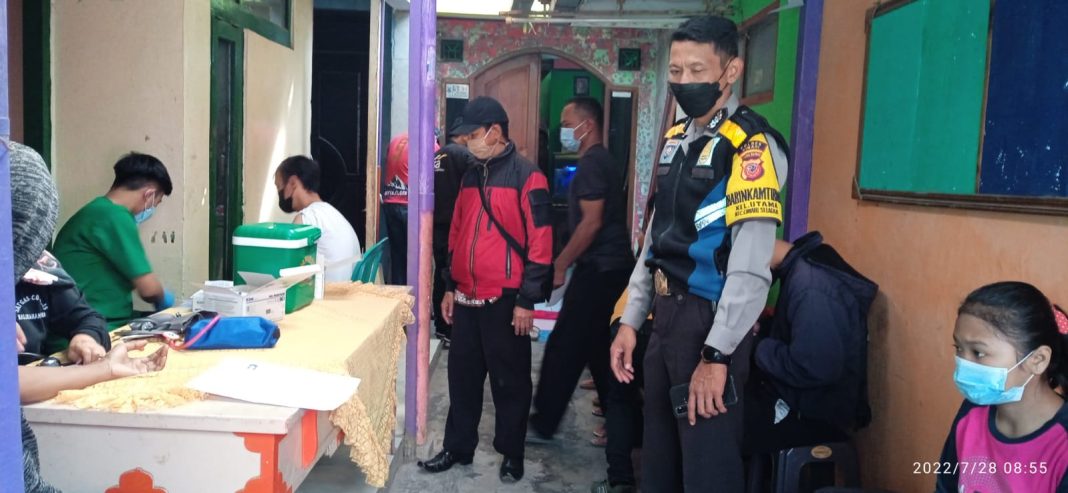 Cimahi – metropaginews.com || Bhabinkamtibmas Kelurahan Utama Polsek Cimahi selatan Polres Cimahi Aiptu Kiki Rachmat P., melaksanakan pengamanan sekaligus monitoring kegiatan percepatan vaksin covid-19, bertempat di RW 11 Kelurahan Utama Kecamatan Cimahi Selatan Kota Cimahi, Kamis (28/7/2022).