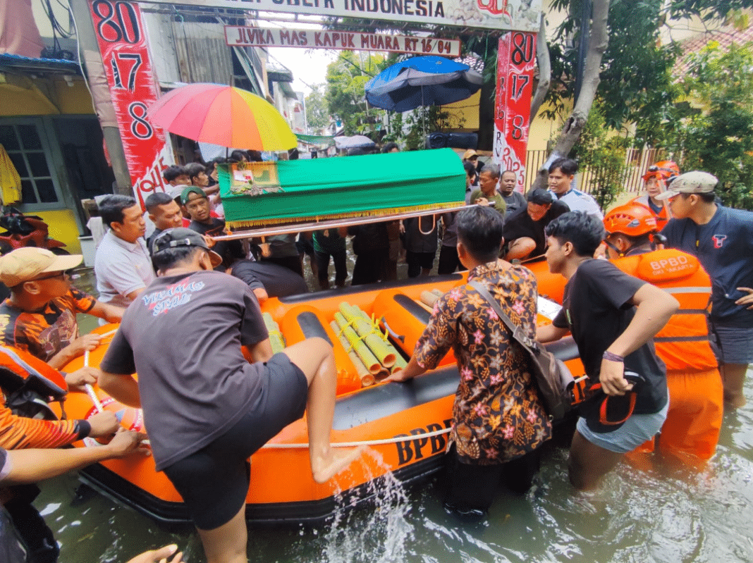 Selain mengevakuasi warga, BPBD Jakarta Utara juga membantu proses evakuasi pemakaman jenazah warga yang terdampak banjir. Dalam kondisi akses jalan terendam, petugas BPBD mengevakuasi jenazah menggunakan perahu karet hingga ke mobil ambulans dengan jarak tempuh kurang lebih 1,5 kilometer.