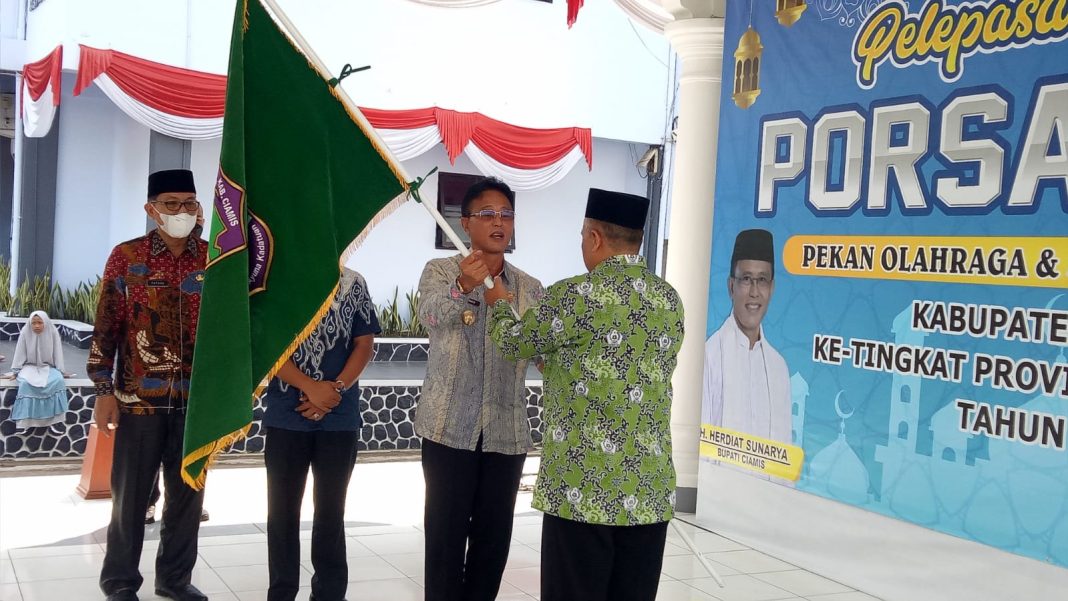 Bupati Ciamis, Herdiat Sunarya secara resmi melepas Kafilah Pekan Olahraga dan Seni antar Diniyah (PORSADIN) Kabupaten Ciamis Ke tingkat Jawa Barat, di Joglo Barat Pendopo, Jum’at (29/7/2022).
