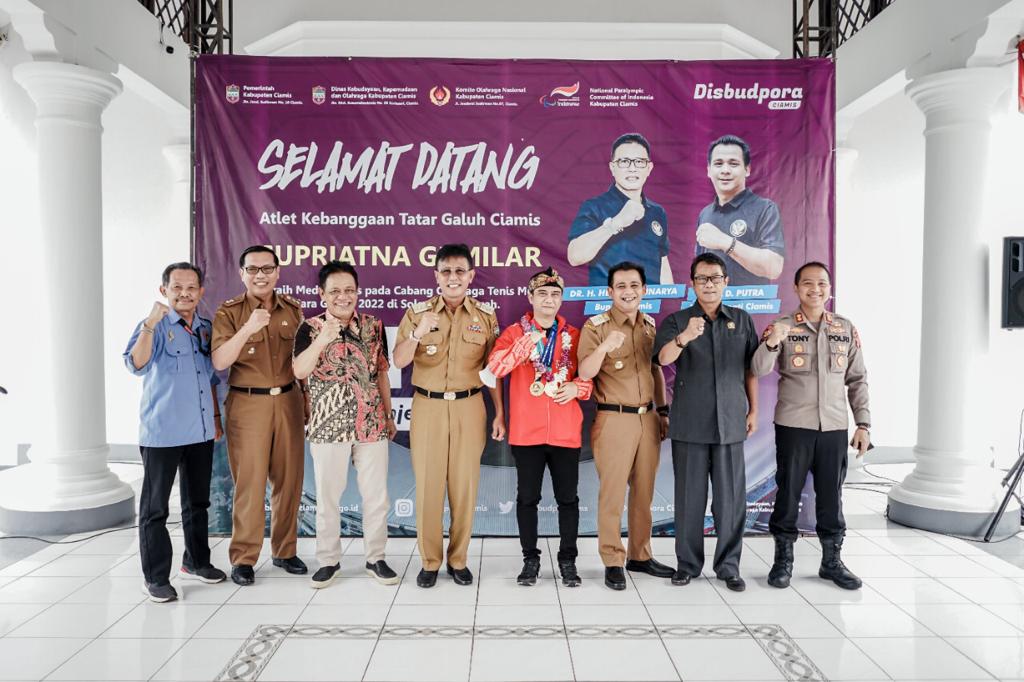Bupati Ciamis, Herdiat Sunarya menyambut kedatangan salah satu atlit kebanggaan Tatar Galuh Ciamis Supriatna Gumilar yang akrab dipanggil ‘Cukink’ di Joglo Barat Pendopo Bupati, Selasa (09/08/2022).