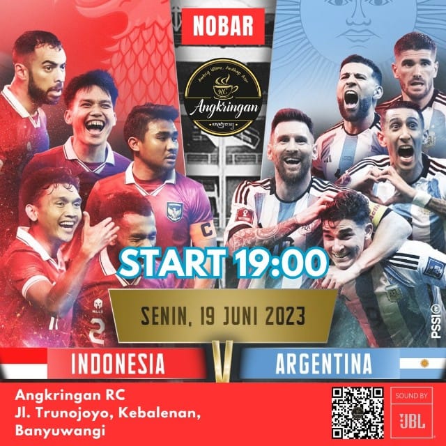 BANYUWANGI – METROPAGINEWS.COM || Pertandingan sepak bola Indonesia vs Argentina di nanti-nanti oleh para pencinta bola khususnya di Kabupaten Banyuwangi. Bingung untuk cari lokasi Nobar, tenang Angkringan RC yang beralamat di Jl.Trunojoyo, Kelurahan Kebalenan, Kecamatan Banyuwangi, Kabupaten Banyuwangi gelar nobar bareng besok pada hari Senin besok tanggal 19/06/2023.