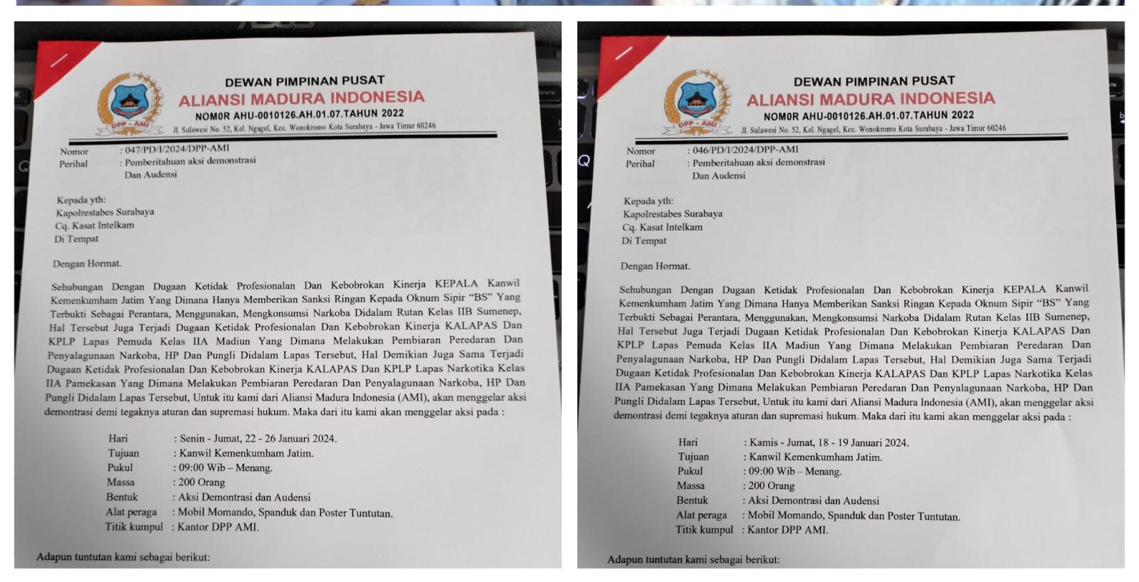 SURABAYA – METROPAGINEWS.COM || Lambannya penanganan Kantor Wilayah Kementerian Hukum dan HAM Jawa Timur untuk menangani persoalan kasus masuknya peredaran Narkoba, HP dan Pungli yang berada di Lapas Pemuda Kelas II A Madiun dan Lapas Narkotika Kelas IIA Pamekasan, membuat Aliansi Madura Indonesia (AMI) memprediksi adanya dugaan main mata.