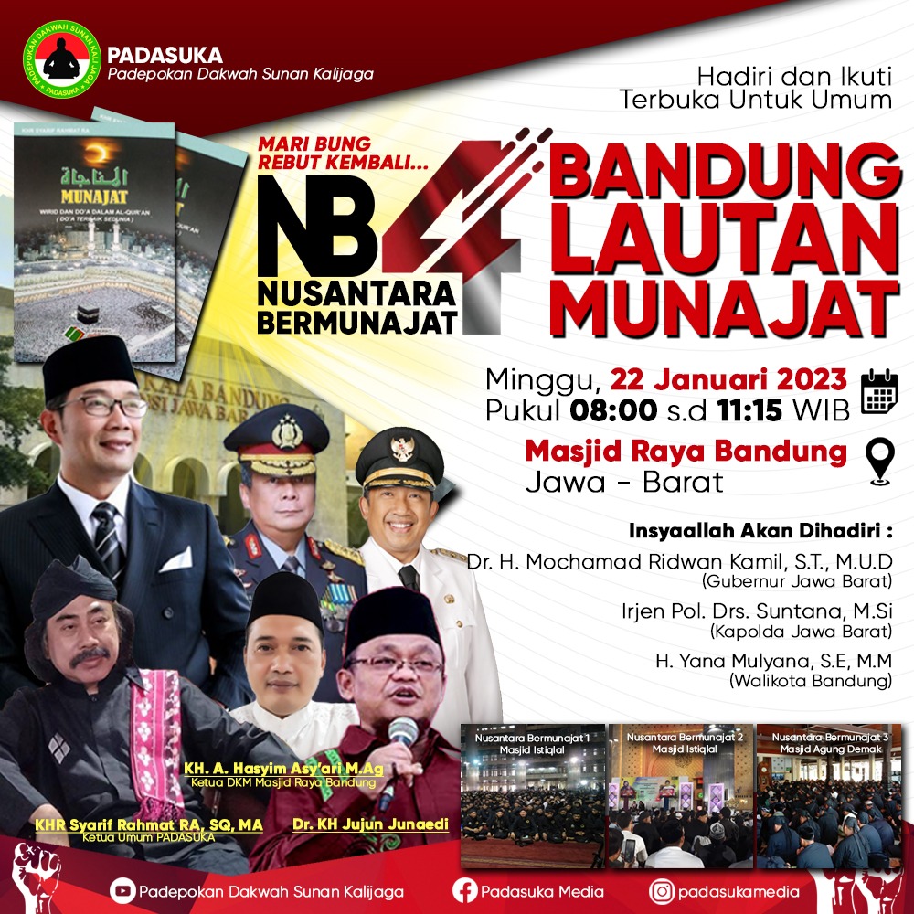 Pelaksanaan “Nusantara Bermunajat Ke-4” tersebut rencananya akan dihadiri langsung oleh Gubernur Jawa Barat, Dr., H., Mohammad Ridwan Kamil, S.T., M.U.D., Kapolda Jawa Barat, Irjen Pol., Drs., Suntana, M.S.i., Walikota Bandung, H., Yana Mulyana, S.E., M.M., Ketua DKM Masjid Raya Bandung, KH., A., Hasyim Asy’ari., M.Ag., dan tamu undangan lainnya.