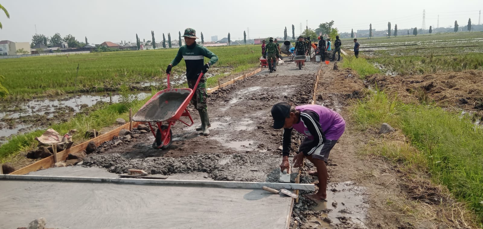 Tampak anggota TNI-Pori serta masyarakat guyub rukun bergotong royong menyelesaikan sasaran fisik tersebut agar selesai tepat waktu. Meski di bawah panasnya terik matahari tidak mengurangi sedikitpun semangat anggota Satgas dan warga ramai-ramai mengerjakan tahap demi tahap pengecoran jalan yang berlokasi di tengah persawahan desa Wirun Kecamatan Mojolaban, Kabupaten Sukoharjo tersebut.