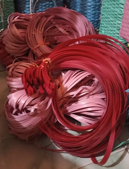 Untuk bahan dasar tas anting, kita manfaatkan dari bahan selang water pass dan tali Strapping band yang keras dan lentur. Bahan tersebut di wilayah kami di kenal tali peti.