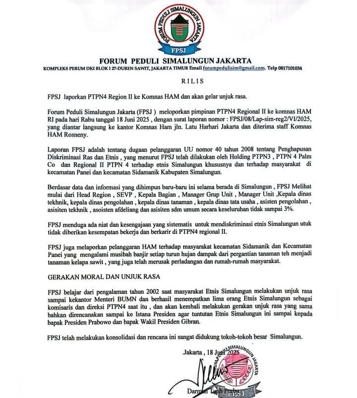 JAKARTA – METROPAGINEWS.COM || Forum Peduli Simalungun Jakarta (FPSJ ) meloporkan pimpinan PTPN4 Regional II ke komnas HAM RI pada hari Rabu tanggal 18 Juni 2025 , dengan surat laporan nomor : FPSJ/08/Lap-sim-reg2/VI/2025, yang diantar langsung ke kantor Komnas Ham jln. Latu Harhari Jakarta dan diterima staff Komnas HAM Rosneny. Simalungun