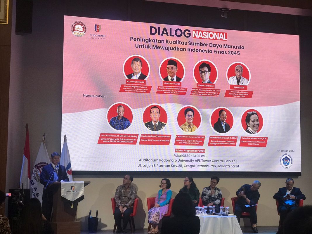 JAKARTA – METROPAGINEWS.COM || Forum Masyarakat Indonesia Emas (FORMAS) menggelar Dialog Nasional dengan tema ‘Peningkatan Kualitas Sumber Daya Manusia untuk Mewujudkan Indonesia Emas 2045’ di Auditorium Podomoro University, Jakarta pada Sabtu (7/9/2024).