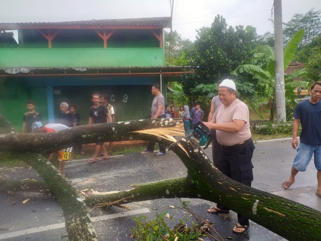 Insiden tersebut akibat Hujan deras disertai angin kencang mengakibatkan pohon tumbang melintang jalan dan mengganggu arus Lalulintas kendaraan
