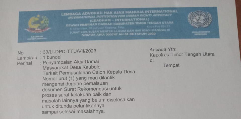 Sesuai surat aksi yang peroleh media ini bernomor 33/LI-DPD-TTU/VII/2023 terlampir 1 bandel dengan perihal: penyampaian aksi damai masyarakat Desa Kaubele terkait permasalahan Calon Kepala Desa (Cakades) nomor urut 1 yang mau dilantik mengenai dugaan pemalsuan dokumen surat rekomendasi untuk proses surat kelakuan baik dan masalah lainnya yang belum diselesaikan untuk ditunda pelantikannya sampai selesai permasalahannya.