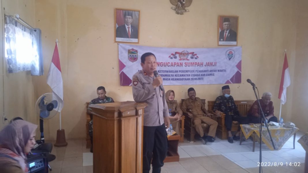 Kapolsek Cisaga Kompol Rokhani menghadiri kegiatan pelantikan dan pengambilan sumpah Pengganti Antar Waktu (PAW) Anggota Badan Permusyawaratan Desa (BPD) Desa Sidamulya Kecamatan Cisaga