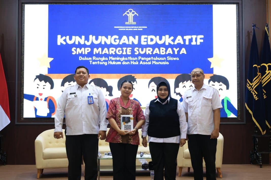 SURABAYA – METROPAGINEWS.COM || Kantor Wilayah Kementerian Hukum Jawa Timur menerima kunjungan edukatif dari pelajar SMP Margie Surabaya pada hari ini (28/5). Kegiatan ini menjadi ajang pengenalan tugas dan fungsi Kanwil Kemenkum Jawa Timur kepada generasi muda, khususnya dalam hal pelayanan hukum dan administrasi permohonan kewarnegaraan.