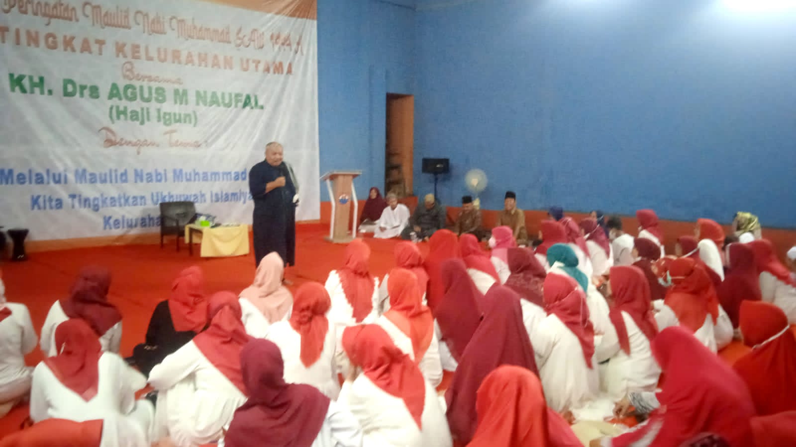 Dalam tausiyahnya ustadz KH.Drs Agus M Naufal, dengan tema meningkatkan ukhuwah Islamiyyah. Kalau kita mengadakan atau memperingati maulid Nabi ada yang bilang bid,ah, berarti dari mulai kita lahir Sampai mati itu adalah bid,ah, kalau ini di anggap bid,ah ibu ibu dan bapak bapak kesini datangnya ke pengajian ini harus pake unta jangan naik angkot karena bid’ a,. Jadi arti dari maulid Nabi SAW itu ada dua makna, pertama majaji kepada Nabi dan yan bukan kepada Nabi tetapi kepada pangkatnya Nabi. Maulid Nabi, kata dalam Nabi yang berasal dari kata naba,a yang artinya cerita, kalau Muhammad artinya Muhammad bin abdilah yaitu Muhammad SAW, dan Muhammad itu artinya kemulyaan. Kalau di artikan untuk mengingat ucapan yang harus di mulyakan yaitu Al-Qur’an, kalau ada yang meninggal kita suka membaca Alquran ini juga di sebut maulid maka membaca surat Yasin sebab para ulama menyebutkan surat Yasin itu adalah qolbunya Alquran, jadi intinya dari ukhuwah itu adalah Rohman Rohim, jadi kita sebagai umat Muslim harus bersatu,” pungkasnya.