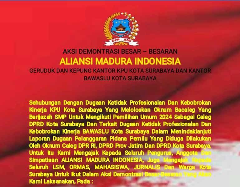 Melihat Ketidak Profesional dan Bobroknya kinerja KPU Kota Surabaya dan Bawaslu Kota Surabaya, Aliansi Madura Indonesia (AMI) tidak akan tinggal diam dan segera akan turun aksi demo besar-besaran.