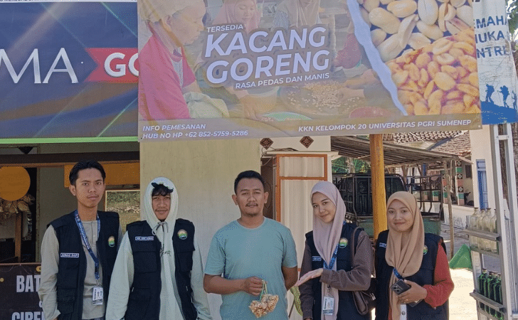 SUMENEP – METROPAGINEWS.COM || Mahasiswa Kuliah Kerja Nyata (KKN) Universitas PGRI Sumenep Kelompok 20 melaksanakan kegiatan pemasangan banner promosi usaha mikro, kecil, dan menengah (UMKM) kacang tanah berbagai varian rasa di Desa Banaresep Timur, Kecamatan Lenteng, Kabupaten Sumenep, (19/08/2025).