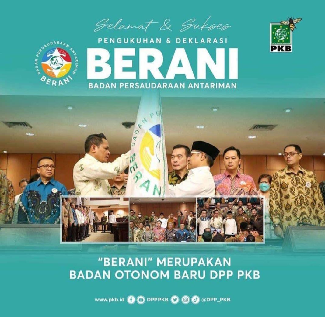 Keikutsertaan elemen masyarakat termasuk BERANI dalam mempromosikan komunikasi antar penganut keyakinan, hal itu akan meminimalkan potensi kesalahpahaman dan perpecahan karena keyakinan,” kata Muhaimin Iskandar saat memberikan sambutan pengukuhan Dewan Pimpinan Pusat (DPP) BERANI, di Kompleks Parlemen Senayan, Jakarta, Senin (31/10/2022), melalui keterangan Ahmad Yani Budi Santoso Ketua Umum Relawan Desa Nusantara pada wartawan Metropaginews. Selasa 1/11/2022.