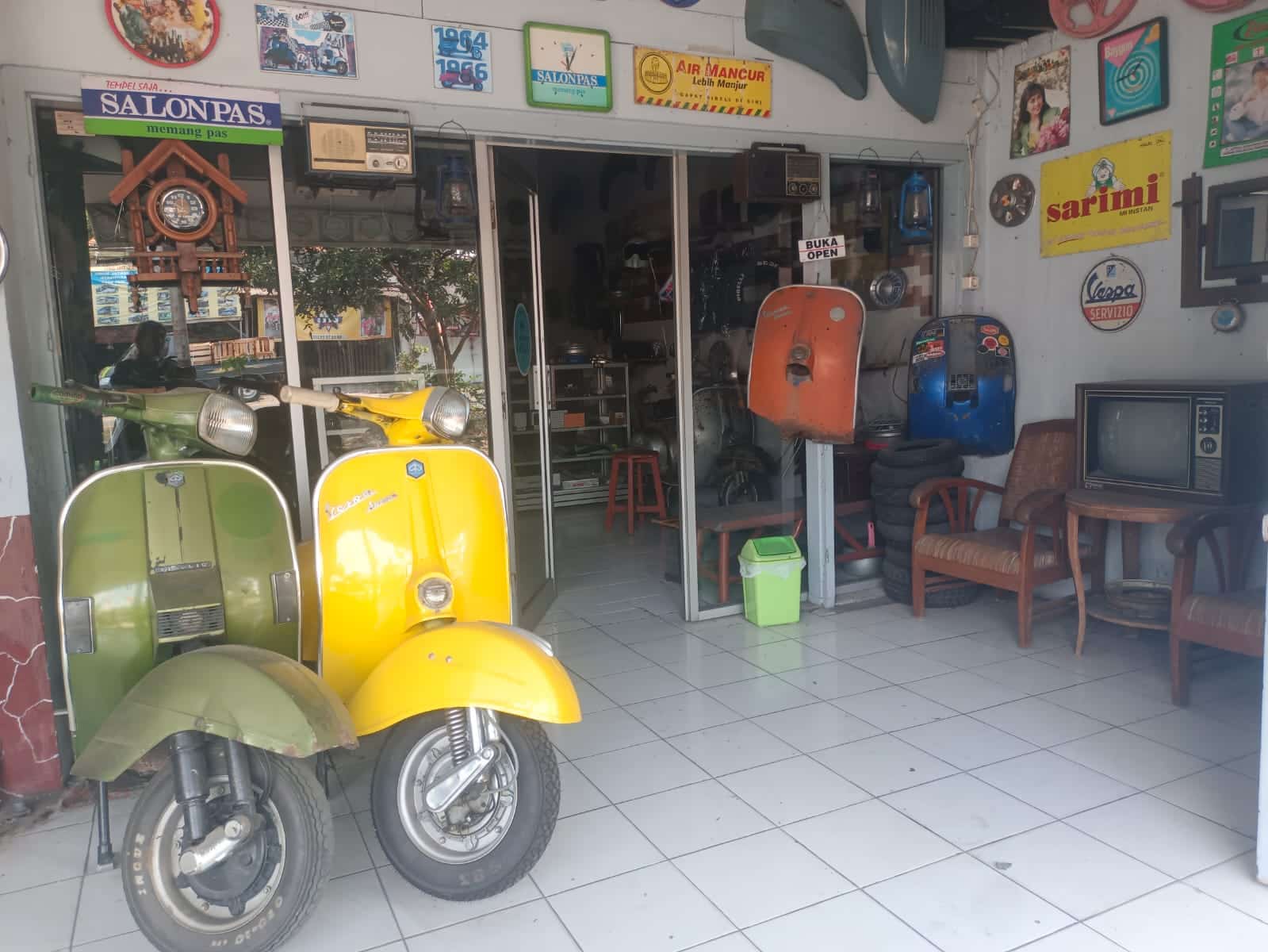 Posisi kios ini nyaris tersembunyi dari pandangan pengendara yang terburu, namun justru karena letaknya pas di pinggir kanan jalur Solo–Jogja, siapa pun yang mengenali “kode rahasia” by pass Srago pasti tak kesulitan menemukannya. Bangunan semi-terbuka dengan etalase kaca dan jajaran motor tua vespa di depannya, serta rak etalase yang memajang ornamen Vespa bertumpuk, simfoni warna merata antara krom, kuningan, dan cat orange tembaga atau hijau muda polesan dempul. Suasana sederhana, tapi setiap detail berbisik puluhan kisah perjalanan mesin dan pencintanya.