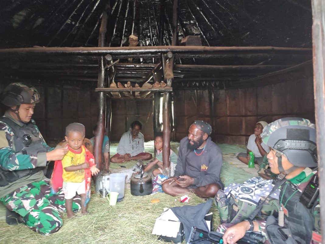 Papua metropaginews.com || Wujud perhatian kepada masyarakat wilayah Puncak Papua, Satgas Satuan Organik Pos Kout di bawah naungan Kolakops Korem 173/PVB memberikan pakaian kepada anak-anak beserta warga di honai honai Kampung Gigobak, Distrik Sinak, Kabupaten Puncak. Papua, Selasa, (24/01/2023)
