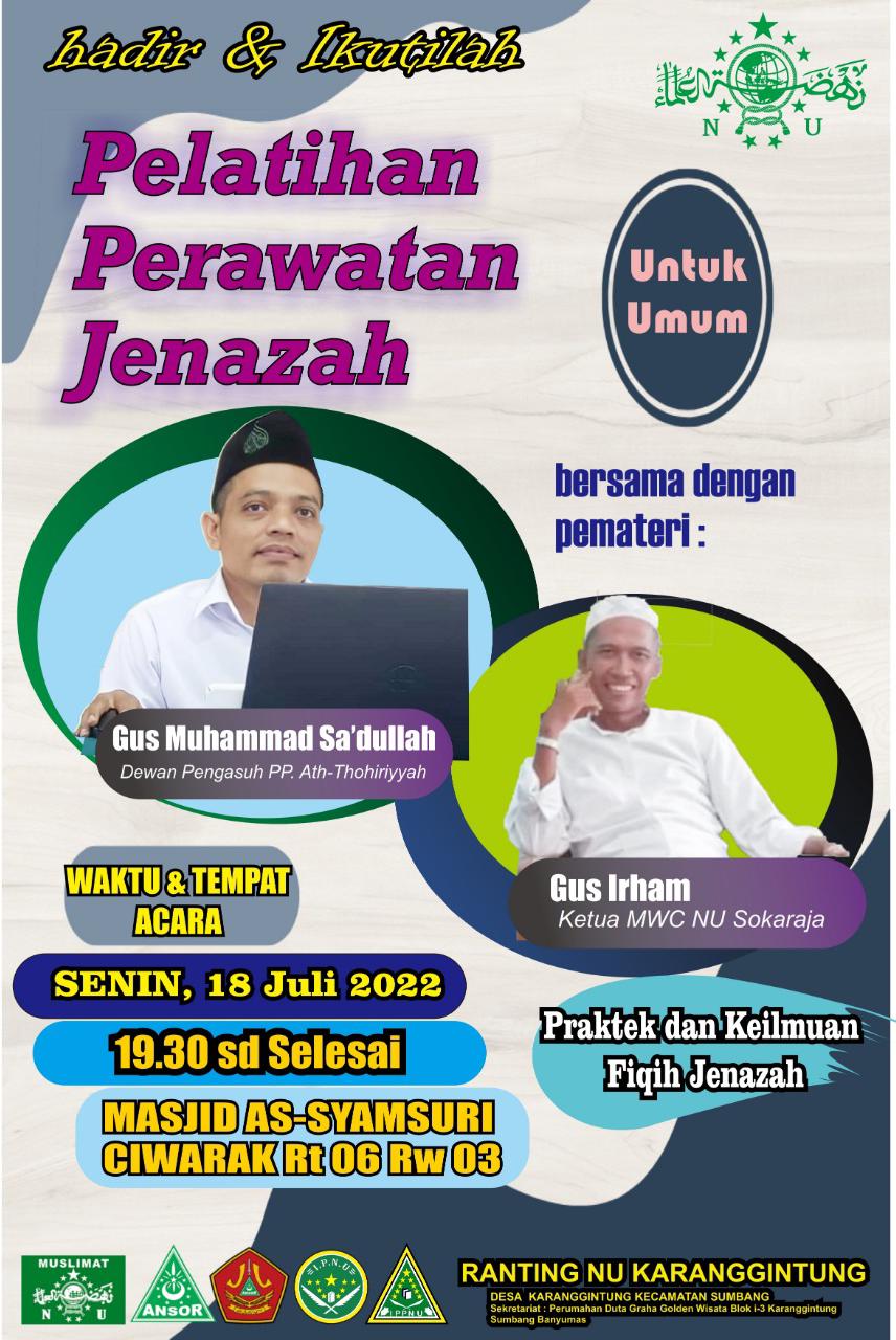 Pengurus Ranting NU Karangintung Kecamatan Sumbang Kabupaten Banyumas bekerjasama dengan Takmir Masjid Asyamsuri menyelenggarakan kaderisasi pelatihan Fikih Jenazah An-Nahdliyah dengan menghadirkan narasumber Gus M. Sa’dullah dan Gus Irchamni, tokoh muda militan NU dari PC Lembaga Bahtsul Masail NU Kab Banyumas.
