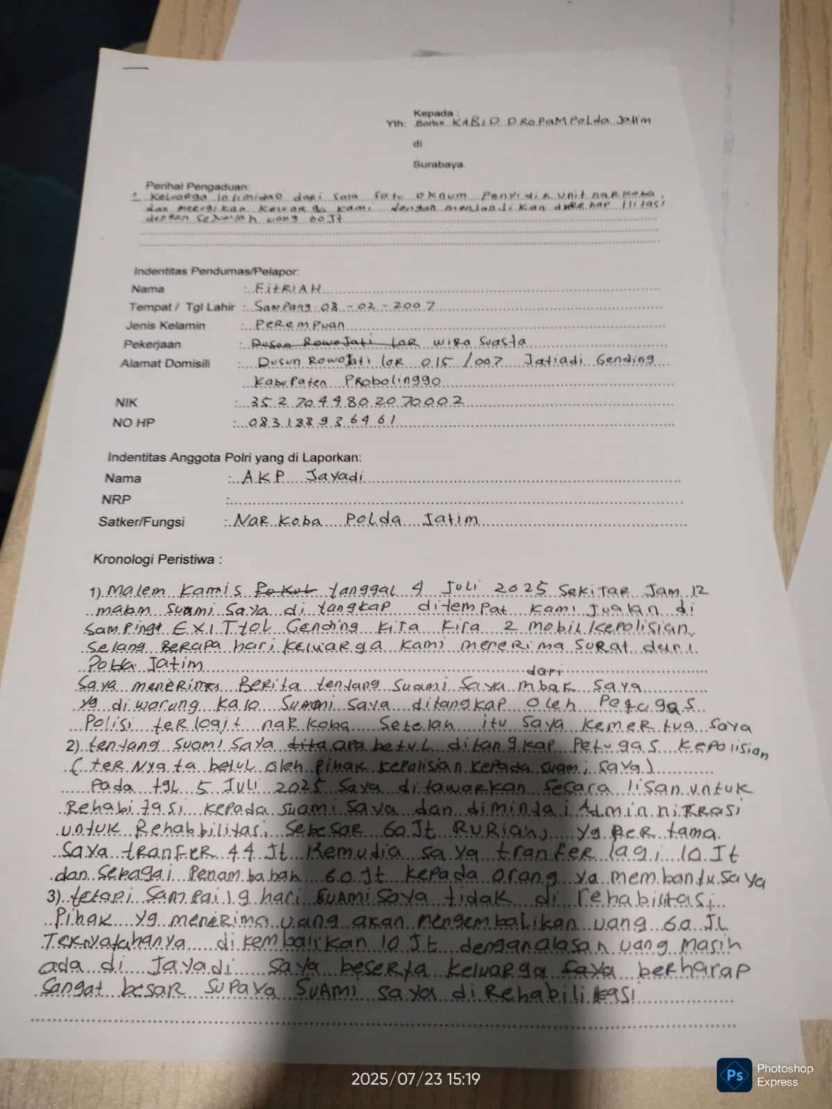 Laporan resmi ke Propam Polda Jatim telah dibuat oleh pihak korban, lengkap dengan bukti transfer dan percakapan terkait transaksi tersebut. Hingga berita ini diturunkan, pihak Polda Jatim belum memberikan keterangan resmi.