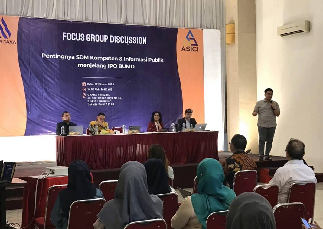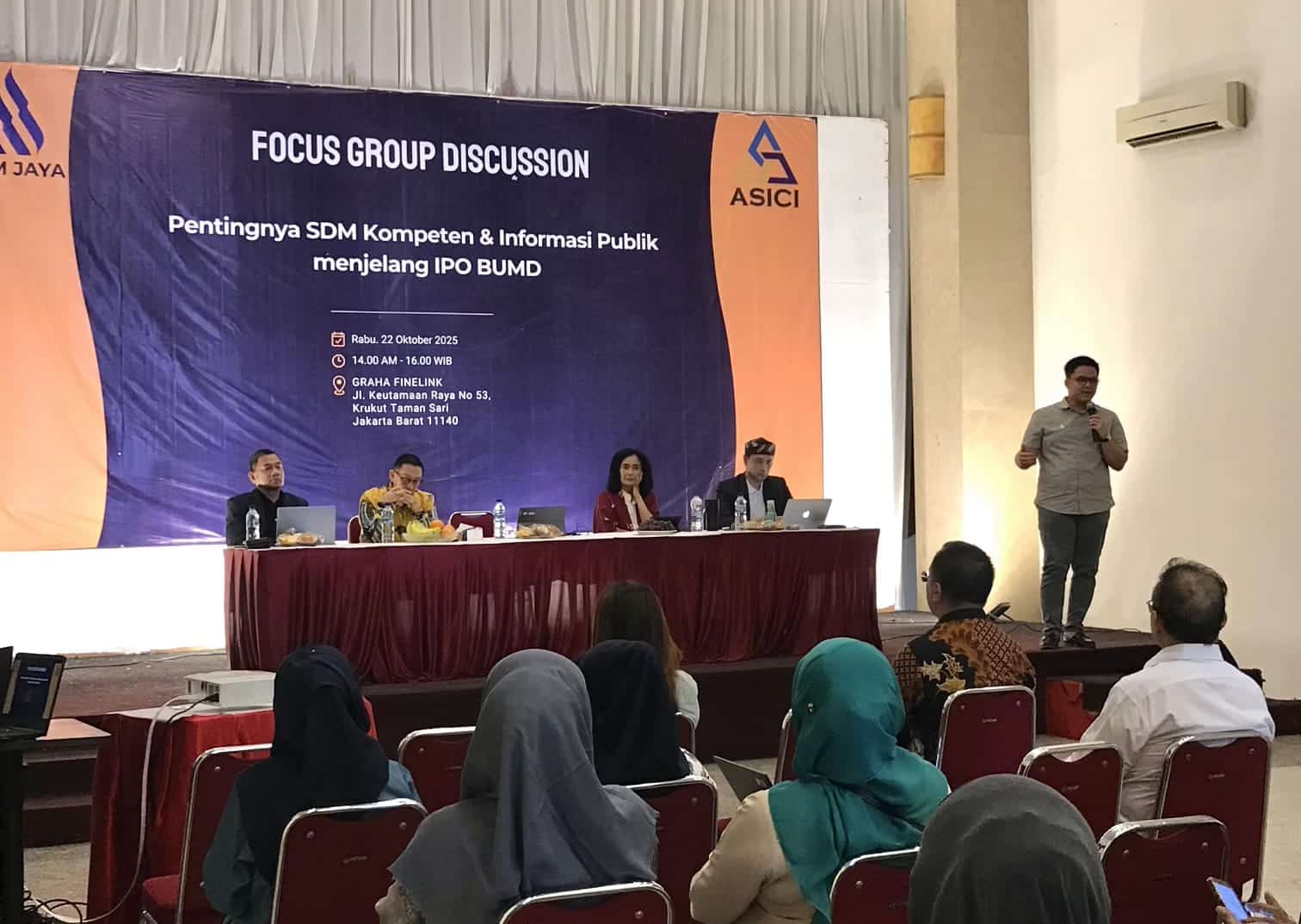 JAKARTA – METROPAGINEWS.COM || Dalam rangka memperkuat tata kelola dan meningkatkan transparansi menuju langkah strategis Initial Public Offering (IPO), Perumda Air Minum Jaya (PAM Jaya) bekerja sama dengan Asosiasi Industri Content Cyber Indonesia (ASICI) menyelenggarakan Focus Group Discussion (FGD) bertema “Pentingnya SDM Kompeten & Informasi Publik Menjelang IPO BUMD” di Graha Finelink, Jakarta, Rabu (22/10). PAM