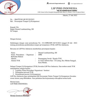 Ketua DPC SPRI Kota Medan,Dl Tobing menjelaskan “bahwa Lembaga Sertifikasi Kopetensi (LSP) Pers Indonesia telah memberi persetujuan TUK dengan surat No: 006/PTUK/LSP-PI/VII/2022 untuk perwakilan Sumatera Utara dalam melaksanakan Sertifiksi Kopetensi Wrtawan (SKW) sebagai pelaksana dari DPC SPRI Kota Medan.