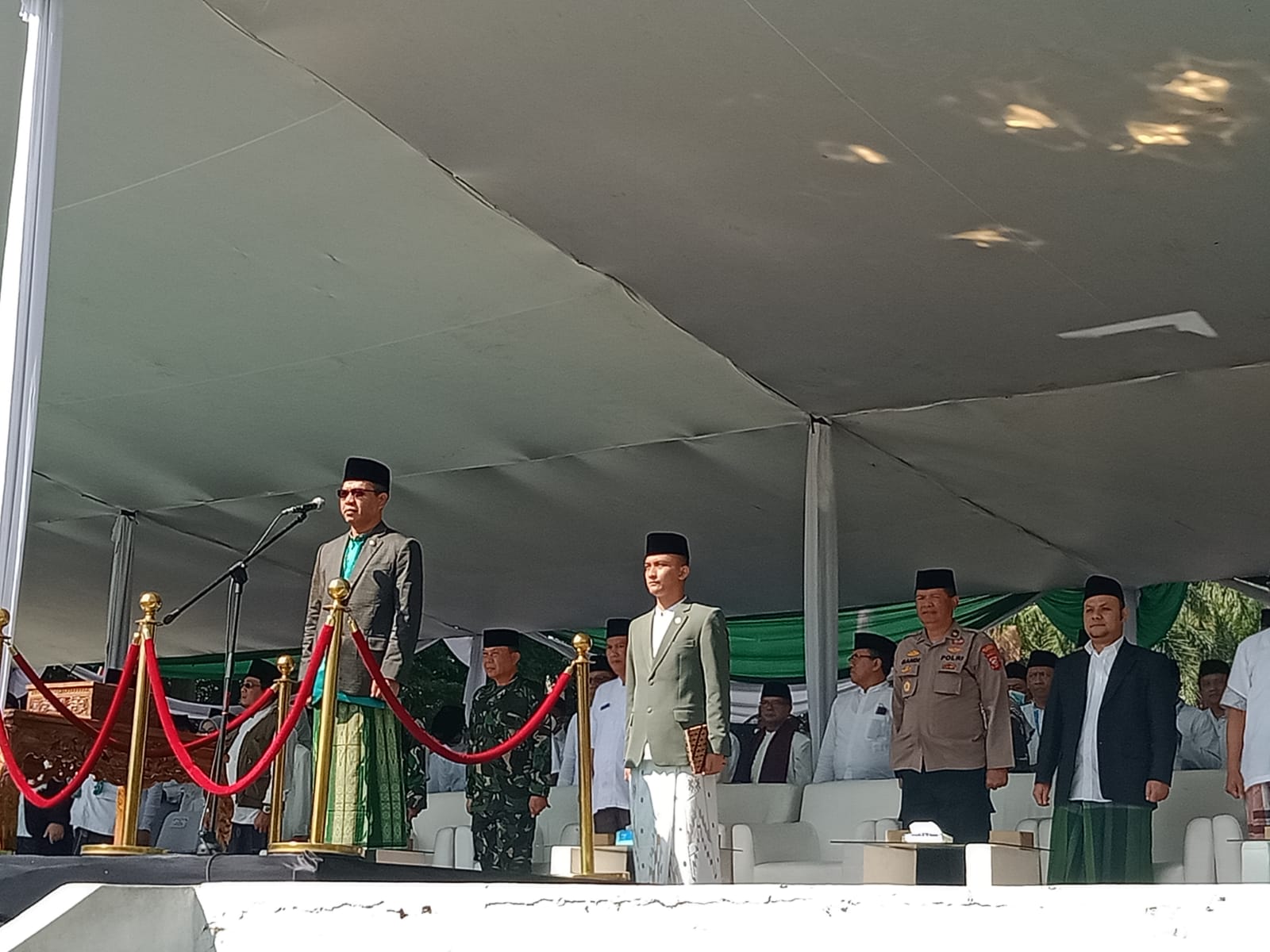 Duduk dijajaran para tamu undangan di hari santri Nasional dalam podium, para alim ulama, perwakilan ormas Islam, MUI, DMI, tokoh masyarakat, Kapolres kabupaten Bandung, komandan Danramil, Danlanud, Kepala Kemenag kab.Bandung H.Abdurohim. MSi serta, jajaran forkopimda.