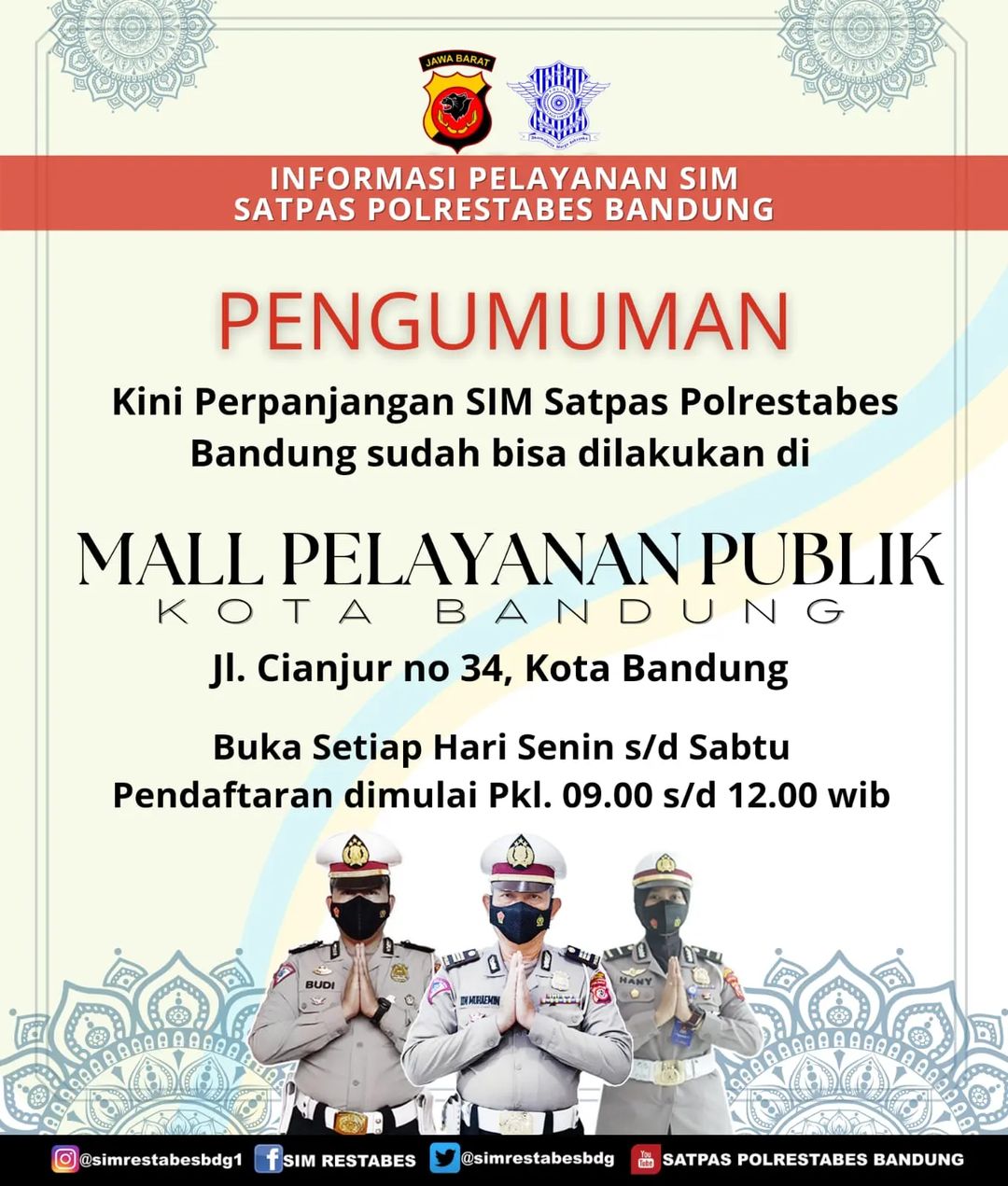 Pelayanan perpanjangan SIM A dan C di Mal Pelayanan Publik (MPP) Kota Bandung di Jalan Cianjur Kota Bandung bisa diakses setiap Senin sampai Sabtu, pendaftaran mulai Pukul 09.00 sampai 12.00 WIB.