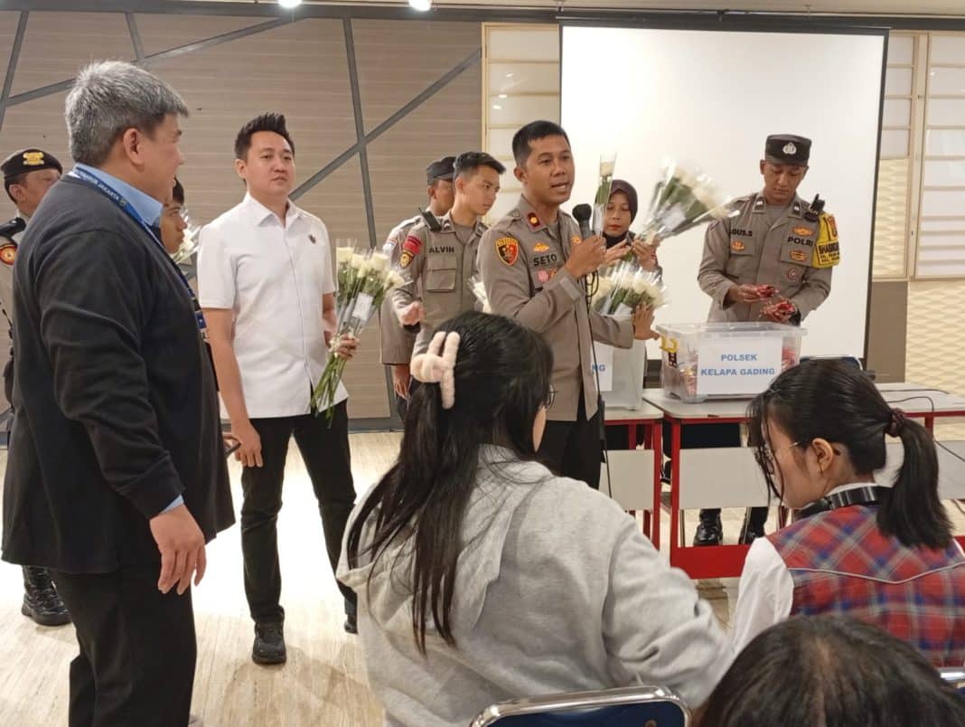 JAKARTA – METROPAGINEWS.COM II Kapolsek Kelapa Gading Kompol Seto Handoko Putra, S.I.Kom,S.IK beserta jajarannya mengadakan kegiatan memberikan bunga mawar putih dan membagikan coklat kepada siswa/i sekolah SMAN 45 Jakarta,SMA penabur Intercultural School NJIS ( North Jakarta Intercultural School) kelapa Gading dan SMK 11 maret Kelapa Gading.( 17-11-2025 ).