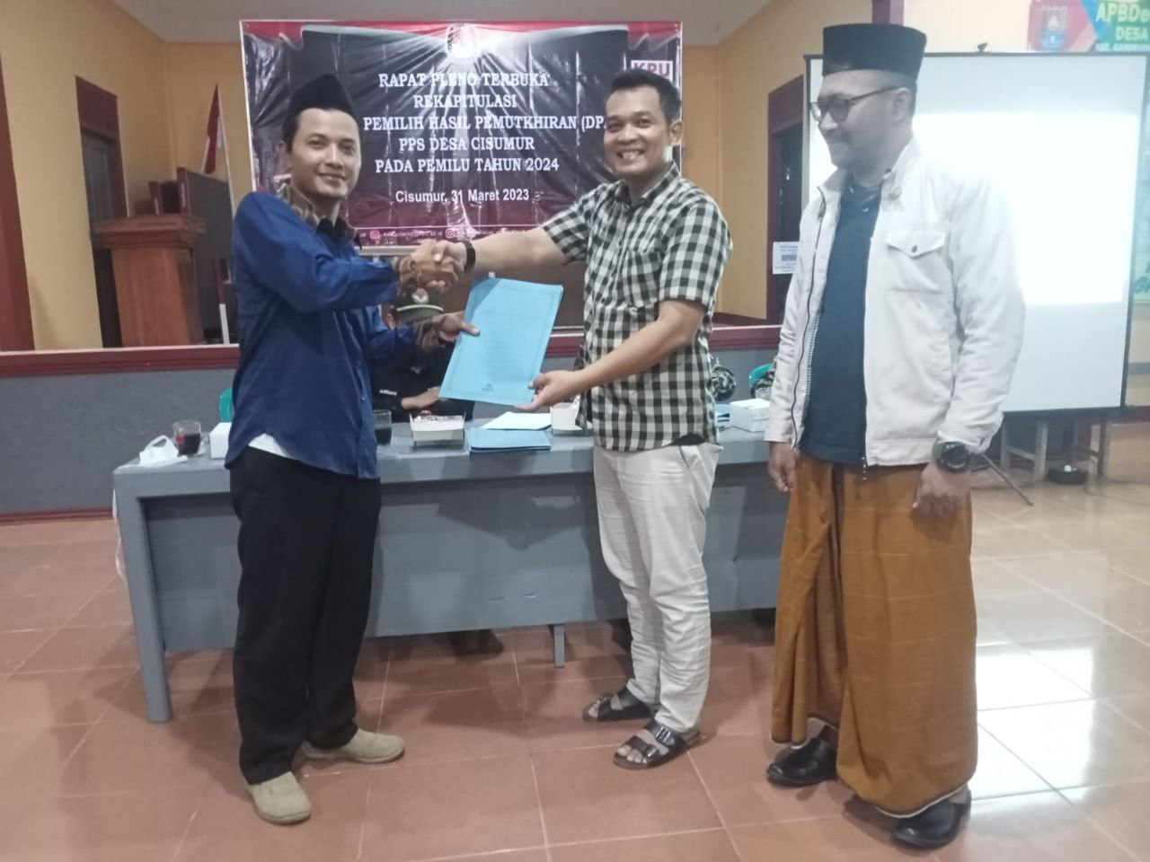Rapat Pleno terbuka ini dihadiri oleh Supriyo Kepala Desa Cisumur, Muharis, S.Pdi.,M.Pd, Muharor, S.Pdi Ketua PPS dan Anggota, Adriyan Pengawas Pemilu Desa.