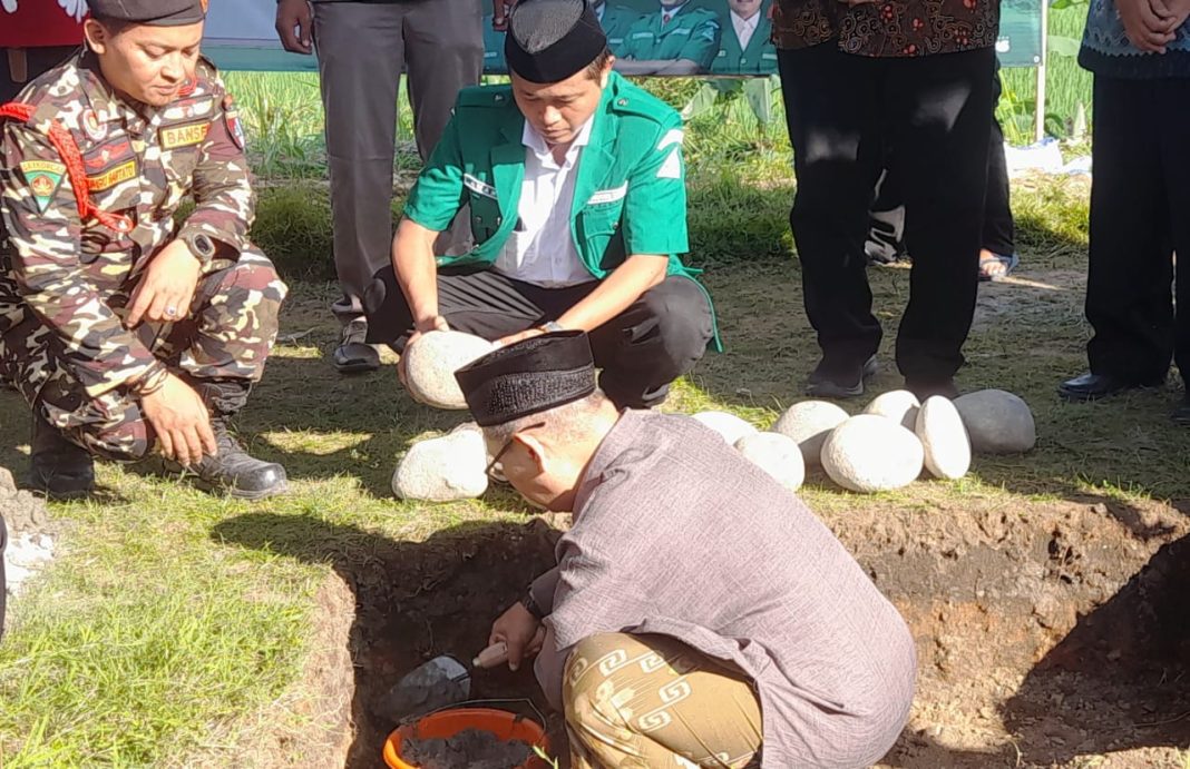 Prosesi peletakan batu pertama dilakukan secara simbolis, diawali dengan doa oleh KH. Mughni Labib, dilanjutkan oleh KH. Imam Hidayat, jajaran pengurus PC GP Ansor, tokoh agama dan masyarakat, serta perwakilan Forkopimcam. Sholawat, takbir, dan semangat kebersamaan bergema menyertai momen sakral ini.
