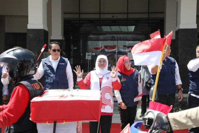 SURABAYA – METROPAGINEWS.COM || Gubernur Jawa Timur (Jatim) Khofifah Indar Parawansa, memberangkatkan Tenaga Kesejahteraan Sosial Kecamatan (TKSK) dan Taruna Siaga Bencana (TAGANA) untuk menyalurkan tali asih. Sasarannya adalah keluarga perintis kemerdekaan, janda perintis kemerdekaan, dan ahli waris keluarga pahlawan nasional. Kegiatan tersebut dilakukan di halaman Kantor Gubernur Jawa Timur, Surabaya, Minggu (13/8/2023).