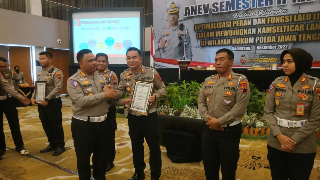 Reward diberikan kepada Sat Lantas Polres Kebumen dalam kegiatan Analisa dan Evaluasi (Evaluasi) Tahun Anggaran 2022, Fungsi Lalu Lintas di bawah Polda Jateng, di Semarang, Selasa 20 Desember 2022.