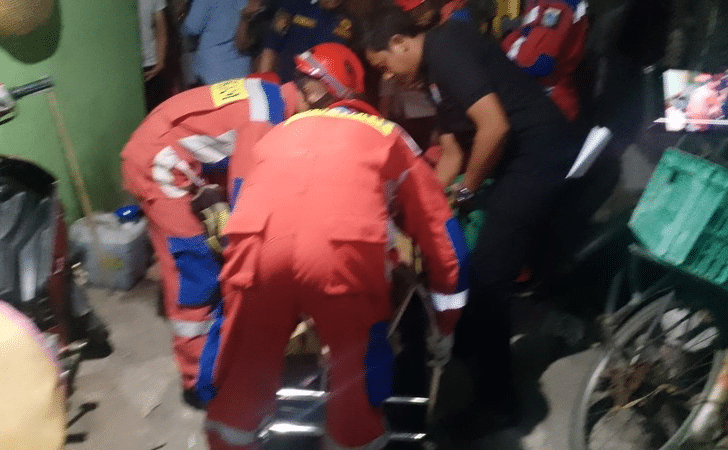 Mendengar teriakan anak tersebut, warga sekitar langsung berdatangan ke lokasi untuk memberikan pertolongan. Korban Heny Purwanti berusia 50 kemudian dievakuasi dari reruntuhan tembok kamar mandi oleh warga.
