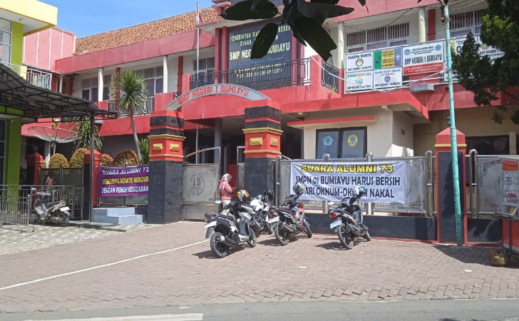 Spanduk yang mengatasnamakan alumni dari berbagai angkatan itu memuat pesan besar: “Selamatkan SMPN 1 Bumiayu!”
