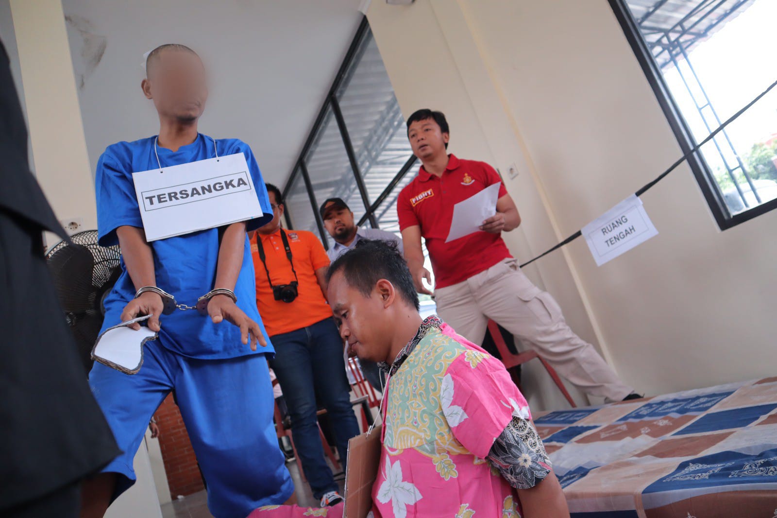 Tersangka memperagakan cara nya menganiaya istri dengan menggunakan pisau bahkan sampai pisau itu patah.