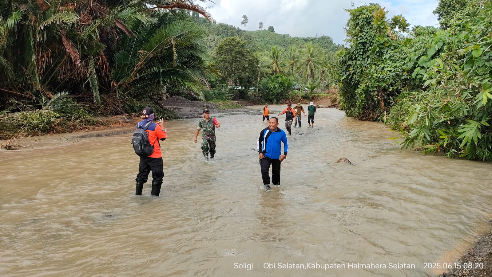 HALMAHERA SELATAN – METROPAGINEWS.COM || Tim Penanggulangan Bencana Alam Kabupaten Halmahera Selatan bersama anggota DPRD dari Fraksi Partai Golkar melakukan peninjauan langsung ke lokasi terdampak banjir di Desa Soligi, Kecamatan Obi Selatan, Minggu (15/6/2025) sekitar pukul 07.50 WIT. Kunjungan ini merupakan tindak lanjut dari bencana banjir yang melanda wilayah tersebut pada Jumat (13/6/2025) akibat curah hujan ekstrem.