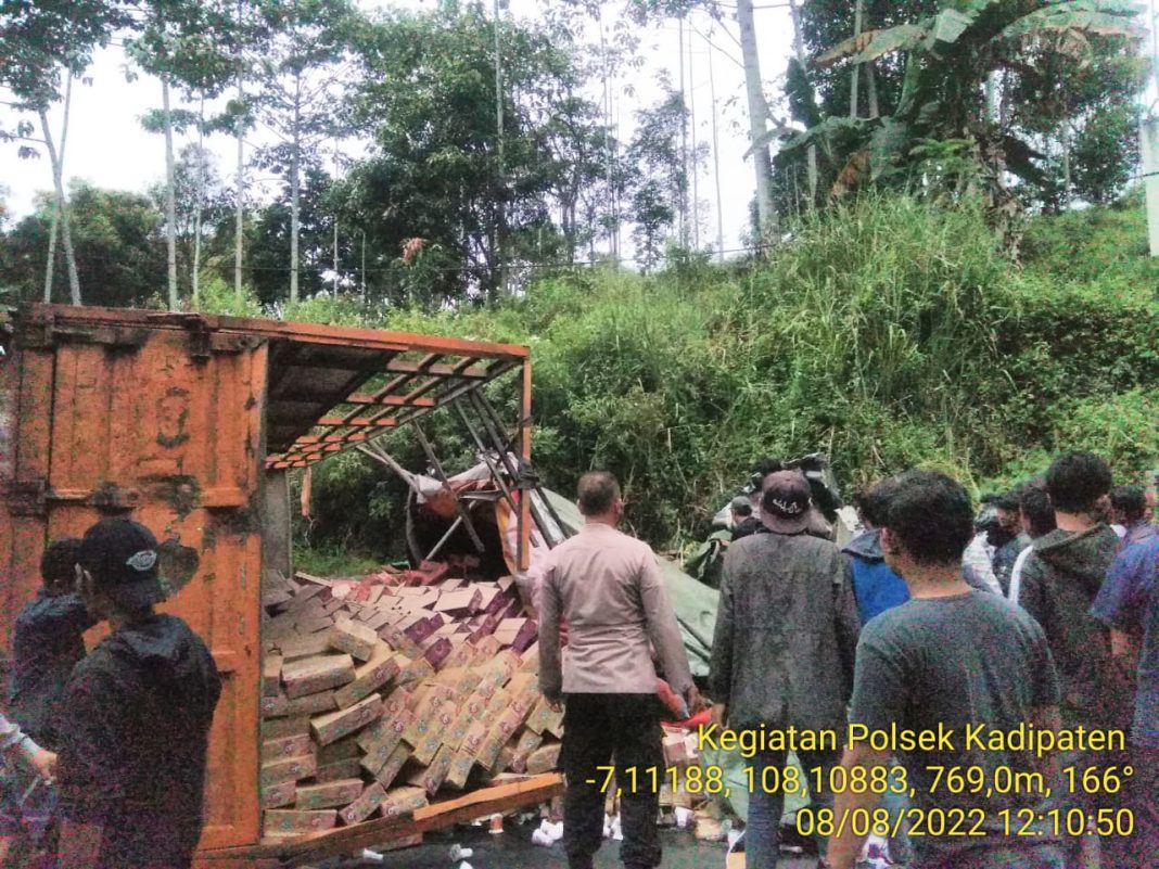 Kecelakaan lalulintas Truk bermuatan minuman kemasan di duga mengalami rem Blom, menabrak kendaraan umum jenis Elf dan menimpa minibus Avanza sehingga menewaskan 2 penumpang, Insiden terjadi di Jalan Gentong Kecamatan Kadipaten Kabupaten Tasikmalaya, Senin 08/08/2022.