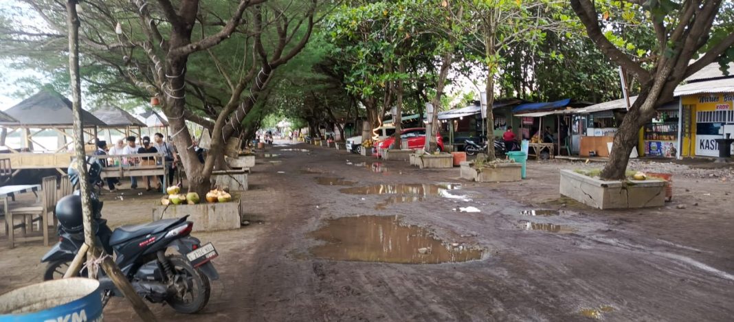 BANYUWANGI – METROPAGINEWS.COM II Pantai Blimbingsari yang terletak 25 km dari Kota Banyuwangi, kini nampak terlihat tak terawat karena disaat musim penghujan tumpahan air menggenang di akses jalan, Minggu (20/4).