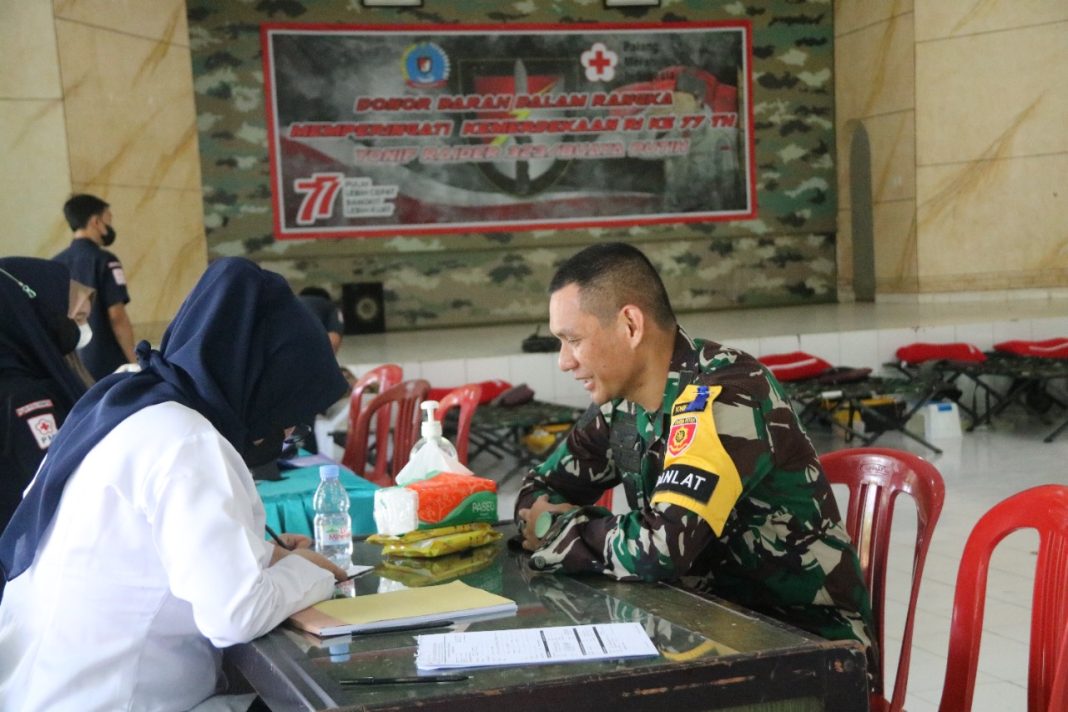 Banjar – Metropaginews.com || Dalam rangka menyambut HUT Republik Indonesia ke-77 Prajurit Yonif Raider 323 Kostrad, Komandan Yonif Raider 323 Kostrad, Letkol Inf Triyono Hadiyanto, S. Sos menggelar kegiatan bakti sosial donor darah, Senin (15/08/2022).